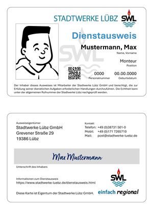 Ein Dienstausweis der Stadtwerke Lübz ist aus Kunststoff und hat Scheckkartenformat. Im Hintergrund sehen Sie das Logo der Stadtwerke Lübz. Auf der Vorderseite befindet sich das Bild des Mitarbeitenden. Unter dem Schriftzug Stadtwerke Lübz finden sie Vor- und Zuname, Position im Unternehmen, Personalnummer und das Geburtsdatum. Alles ist direkt aufgedruckt, es gibt keine Aufkleber.